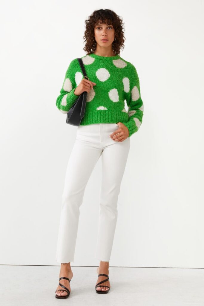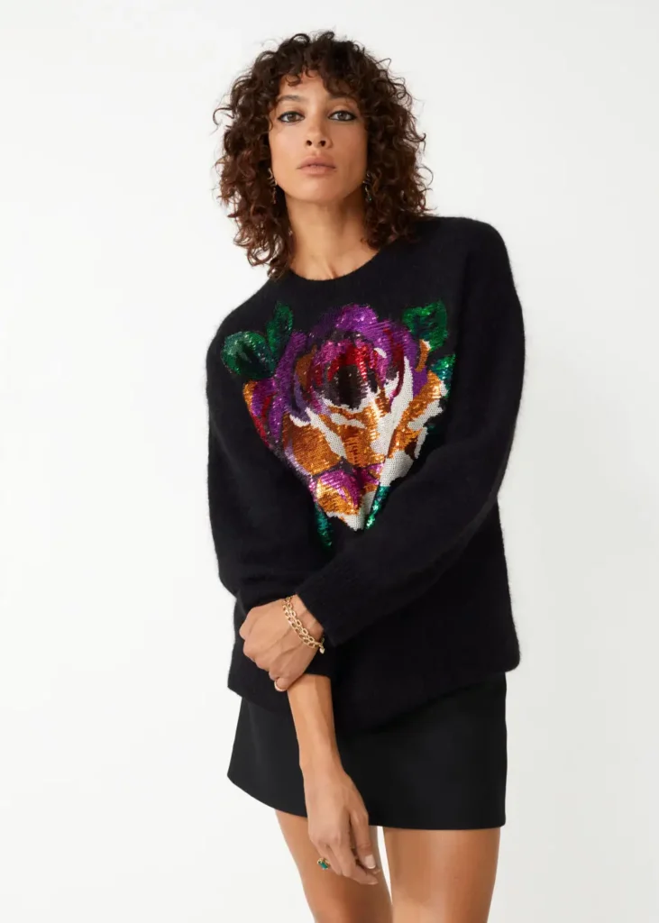 A bright green sweater like this is best styled with wardrobe staples so the focus remains on it. The sequined floral jumper would be perfect under a neutral coloured oversized blazer to make it a little more casual and fun.