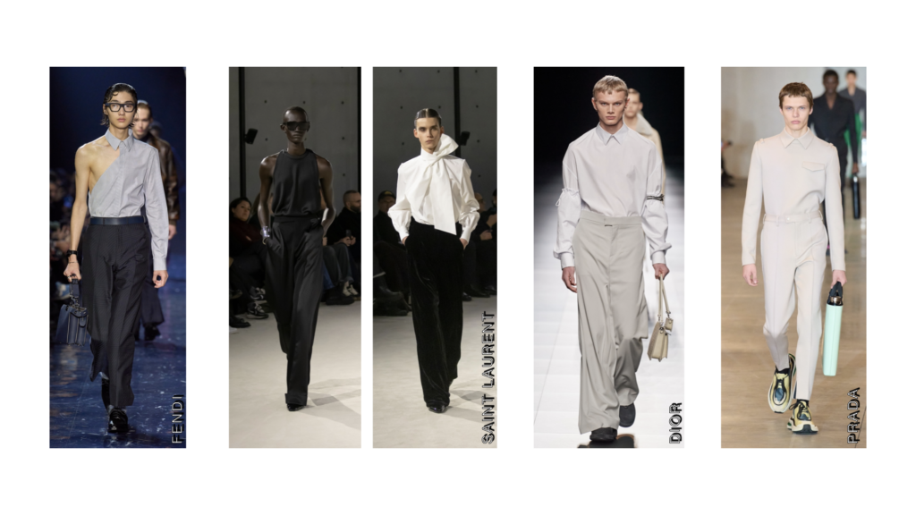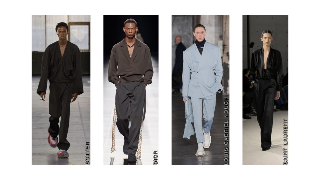 While tailoring is a mainstay in menswear, relaxed tailoring has made an appearance in formal tailoring receiving a more relaxed vibe through softer materials, newer silhouettes and relaxed styling. In Louis Gabriel Nouchi’s show, you’ll see flowy fabrics used and the full suit looks more approachable. Dior has remade the jacket into a top, with jacket lapels seen on a V Neck top styled with relaxed pants. Saint Laurent has also designed tuxedo inspired looks, with draped silk tops with a cummerbund styled with satin trousers, creating a relaxed yet polished look.