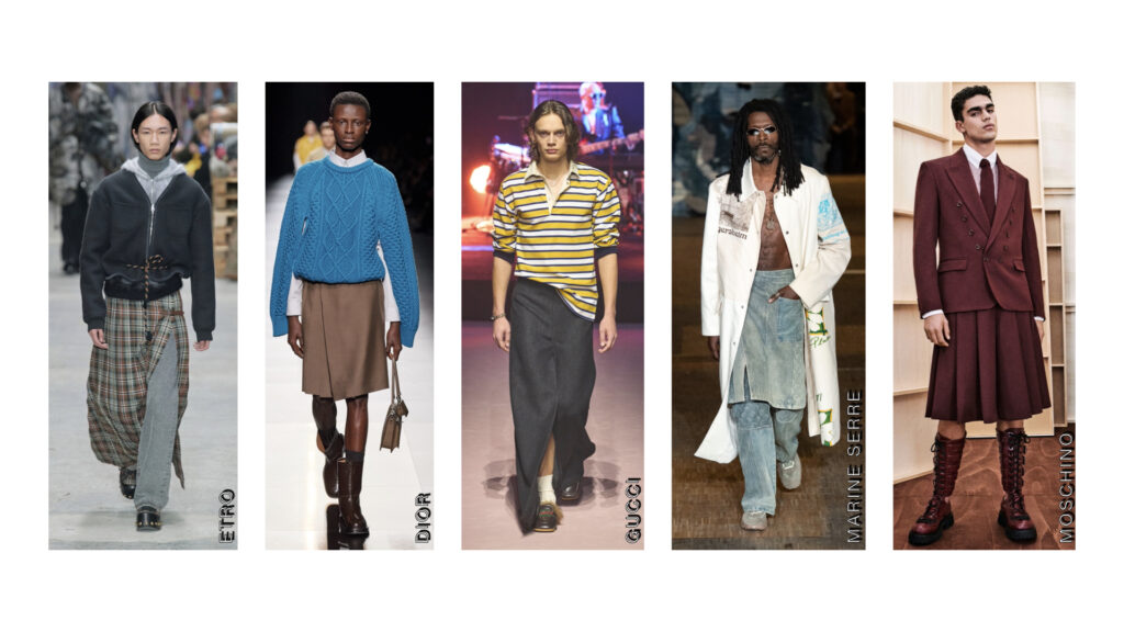 Are we stepping back into a Kilt era? The resurgence of skirts or kilts during this season was a surprise. WIth this element appearing repeatedly across many brands. Some styled them over pants while others sent skirts down the runway. Nonetheless, we are here for these skirt looks. Dior’s kilt look was made very memorable with Robert Pattinson wearing a skirt during their show, other brands like Gucci and Marine Serre also has some skirt looks for their show. It seems that the kilts or skirts might be coming back in end of this year.